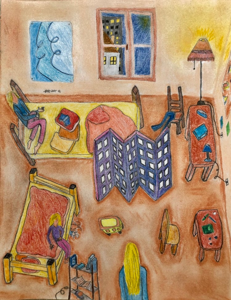 Elle est assise à son bureau, moi en face d’elle, tout près. Tellement près que je peux presque lire ce qu’elle écrit quand je parle. Je lui demande pourquoi elle prend des notes, elle me répond « pour me souvenir ». Tiens donc. Le long du mur il y a un divan qui m’intrigue pas mal. Qu’est ce que ça peut bien changer de parler allongée ? Elle me dit que dans cette position ce sont d’autres mots qui sortent, aussi parce qu’on ne voit pas le docteur qui est derrière soi. Ça me plairait pas je crois. Sur ma droite il y a une grande bibliothèque. Avec des livres que je vois aussi chez moi, je reconnais les noms : Freud, Dolto, Klein… sauf qu’ici ils sont derrière une vitrine. Ça donne encore plus envie de les toucher. J’aime bien les regarder quand j’ai pas envie de parler. Les livres d’art aussi, et les petits objets nids à poussière posés un peu partout.